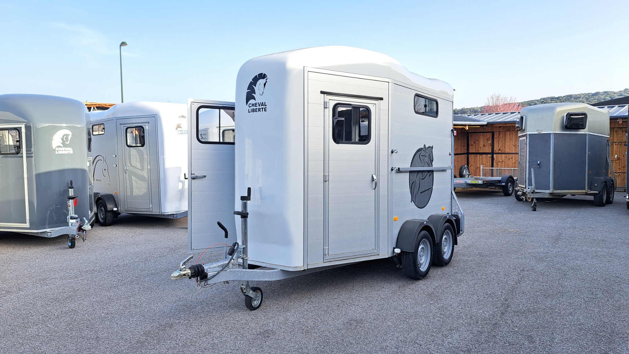 La remorque van pour chauvaux Cheval Liberté Touring Jumping est un modèle 2 places haut de gamme privilégiant le volume et l'organisation grâce à sa conception en aluminium du plancher et des parois et de son toit aérodynamique en polyester. Il se distingue par sa vaste sellerie verticale intégrée avec double accès et ses deux grandes portes cavalier, tout en bénéficiant de série de la suspension Pullman 2 pour un confort de route exceptionnel. C'est le choix privilégié des compétiteurs recherchant un van spacieux, stable et ultra-fonctionnel, offrant un espace de rangement optimal pour tout l'équipement de concours.